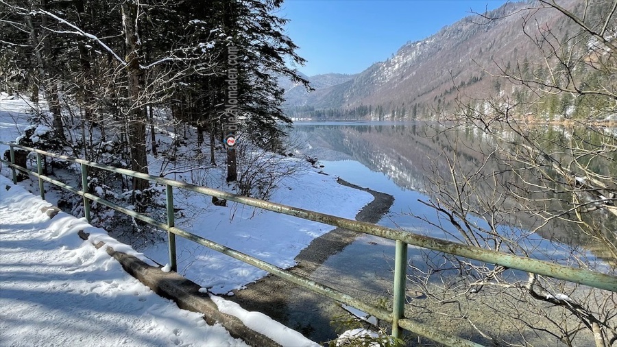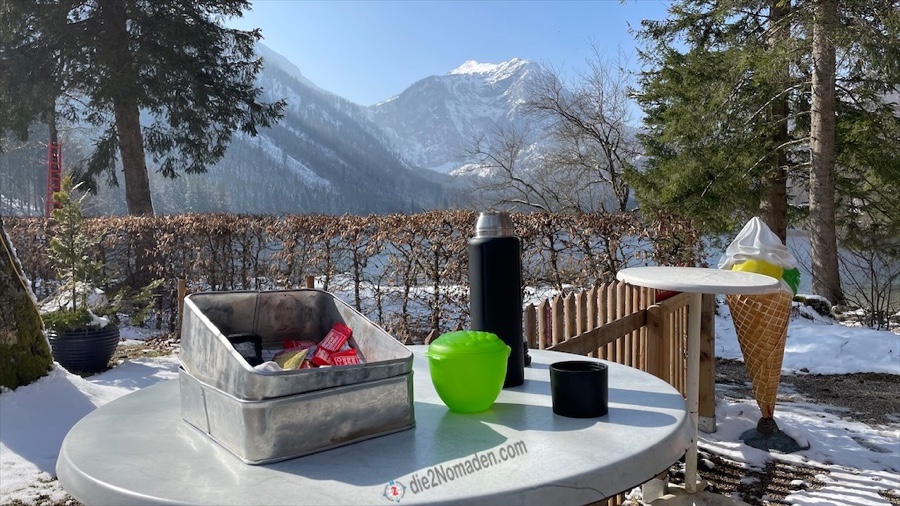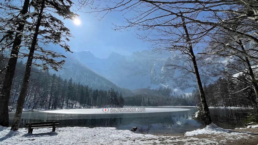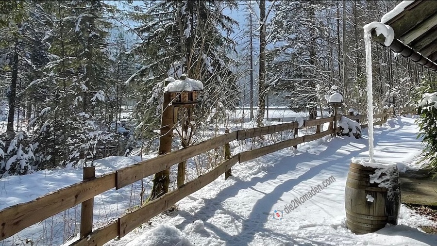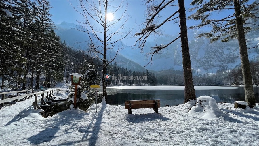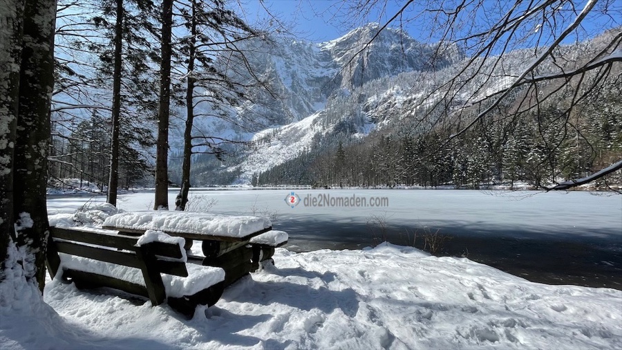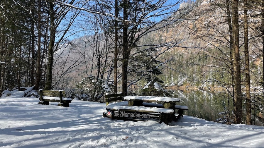 Die vielen Tische und Bänke um den See sind ebenfalls noch mit einer zentimeterdicken Schneehaube versehen und glitzern in der Sonne.