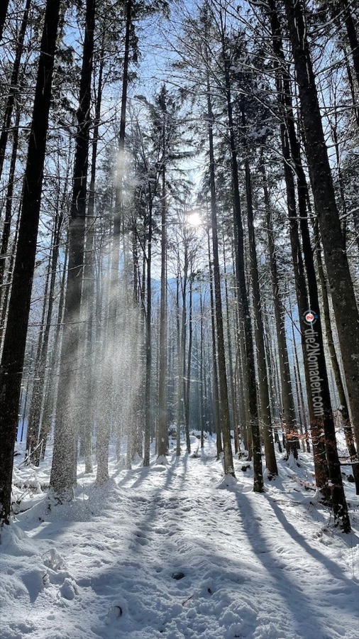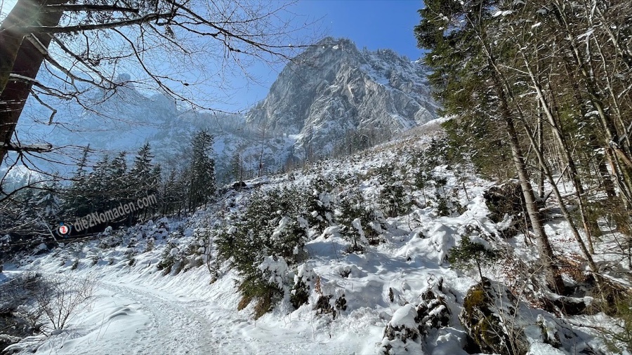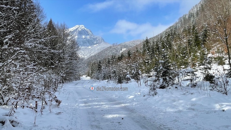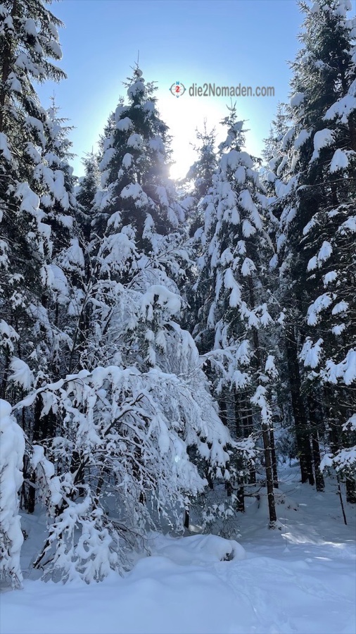 Schritt für Schritt merken wir, dass hier im hinteren Talschluss der Schnee immer mehr wird. Die Bäume tragen ein weißes Kleid und glitzern mit den Eiskristallen der sich immer wieder entladenden Äste in der Luft um die Wette.
