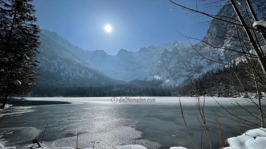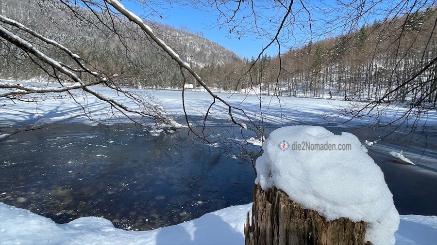Es gibt am Parkplatz nur mehr sehr wenig Schnee, doch die Nächte dürften in diesem Talschluss noch ziemlich kalt sein, wenn man an der Eisschicht am Wasser sieht.