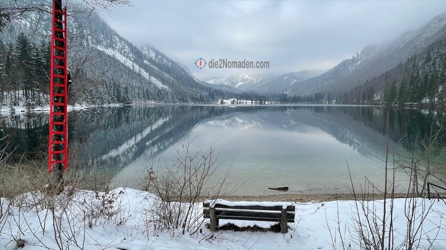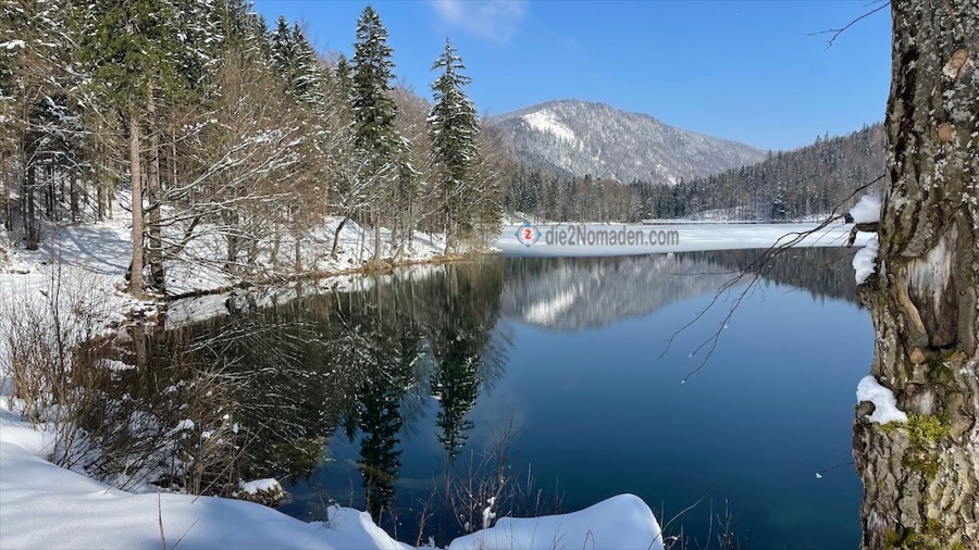 Am Rückweg bemerken wir, dass eine der zwei jungen Damen, die uns begegnet sind, einen Sprung in den See wagt. Ohne Bikini. „Wow, mutig, der See ist sicher eisig kalt“, denken wir uns gerade, als in dem Moment ein älteres Paar oberhalb von uns vorbeigeht mit den Worten: „Das ist doch eine Frechheit, nackt baden ist in Österreich verboten!“ 🫣