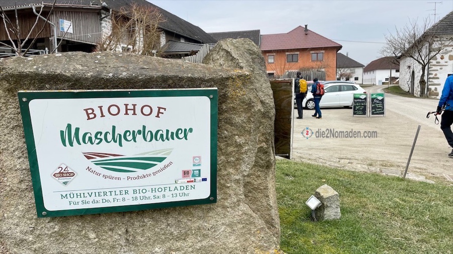 Der Hohlweg durch den Wald ist voll mit altem Laub und man muss gehörig aufpassen, dass man nicht ins Rutschen kommt. Einige Hügel später muss nur noch ein Anstieg zum Ortsteil Winden absolviert werden und schon wird der Biohof Mascherbauer, bei dem wir vorreserviert haben, sichtbar.