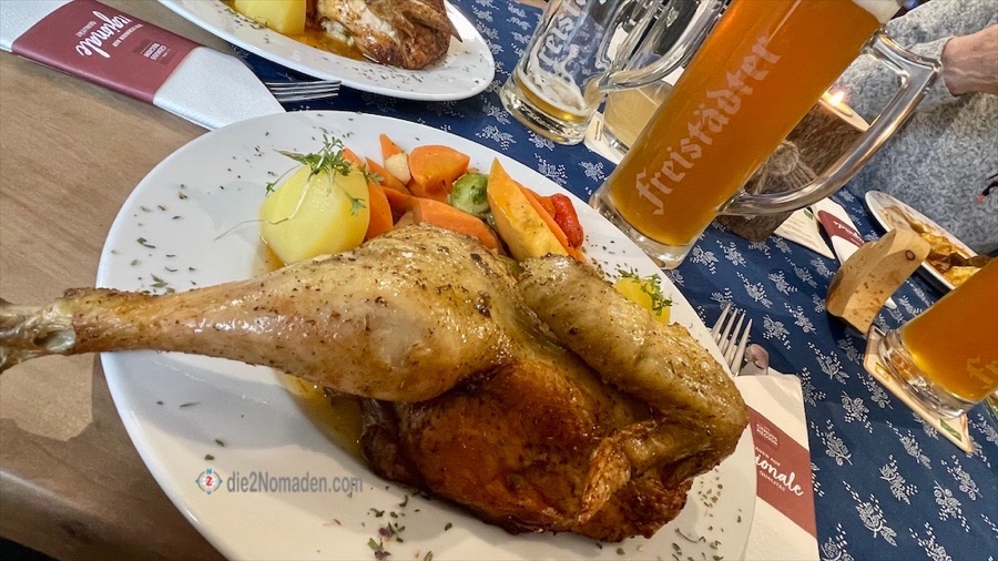 Der Chef persönlich nimmt die Getränke auf und klärt uns über seine Samstagsspezialität, ein gefülltes Weidehuhn in der Kiste mit glasiertem Gemüse auf. Natürlich gibt es auch „a la card“.