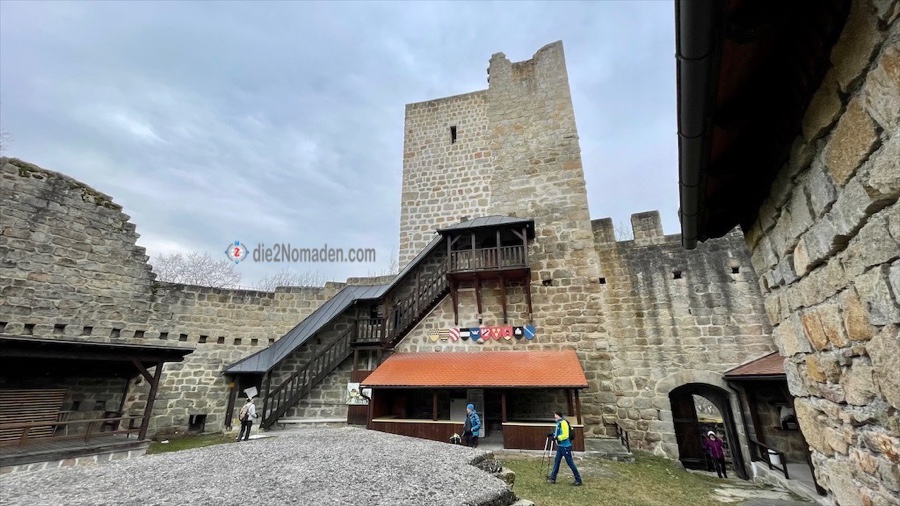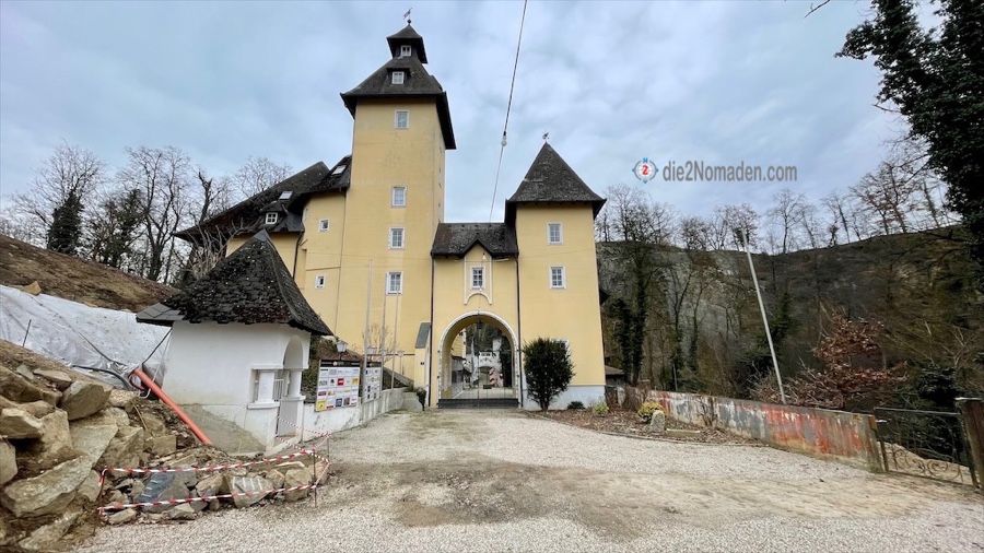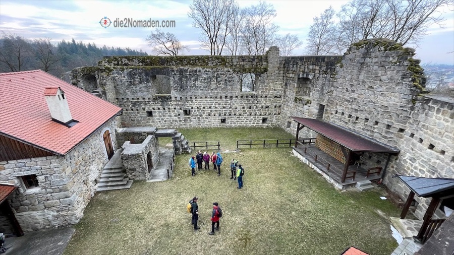 Dieser Hohlweg bringt uns hoch zum Ortsteil Windegg. Hier folgen wir der Straße, nehmen nochmals einen Waldweg und gelangen so kurz zur restaurierten Burgruine Windegg.