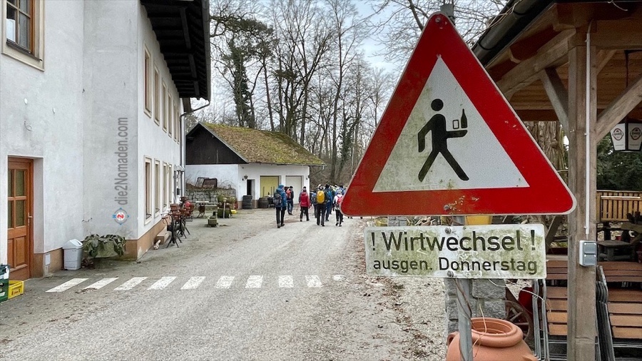 Ein, zwei Getränke bzw. 1,5 Stunden später sammelt sich die Gruppe wieder vor dem Biohof und schreitet nun mit vollen Bäuchen vom Hof.