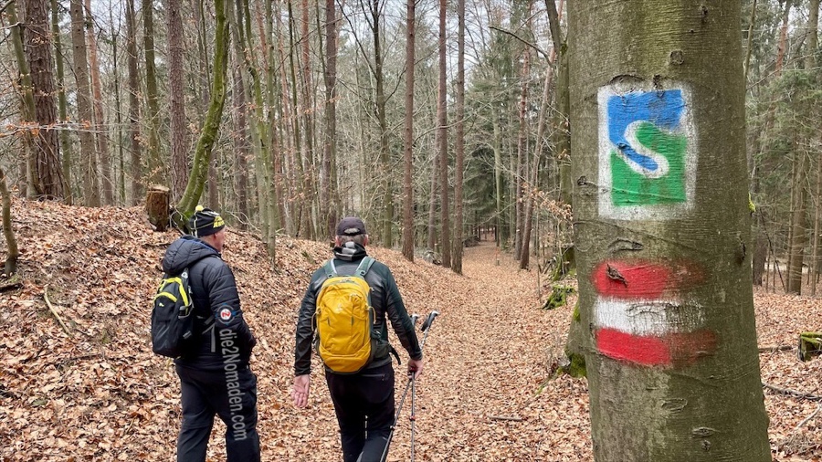 Es geht einen gemütlichen Waldweg empor und zeitweise müssen wir durch den Windschlag gefällt Bäume umgehen. Langsam aber sicher erreichen wir das Hauptziel unserer heutigen Rundwanderung, den „Weltstoa“.
