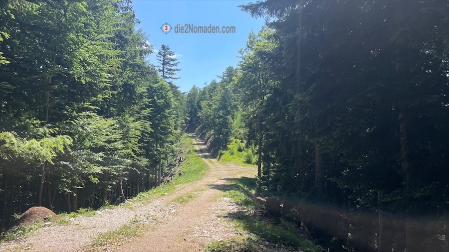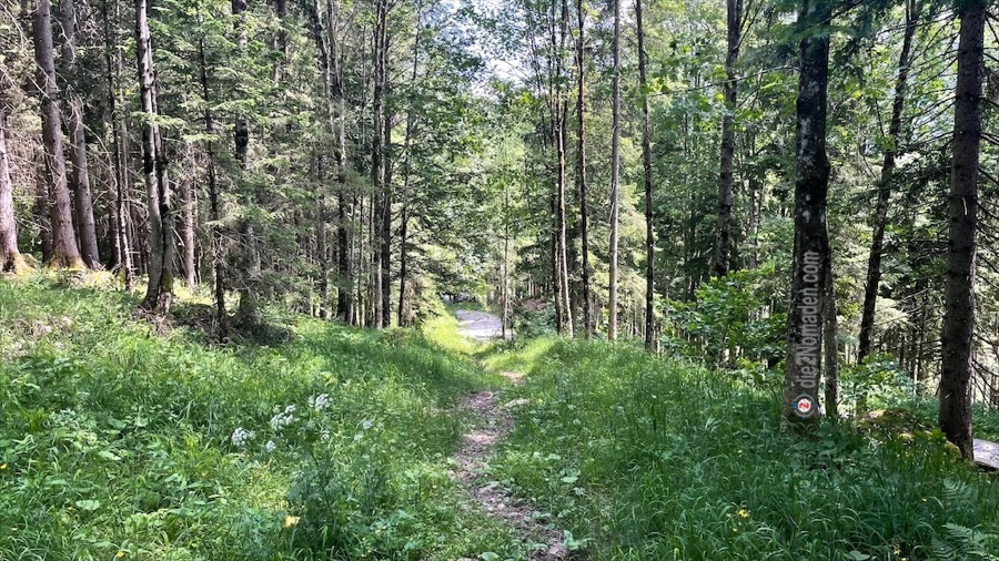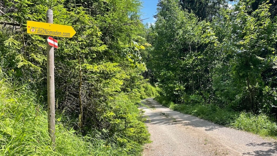 Zuerst startet der Wanderweg zwischen zwei Forststraßen stetig bergauf, bis wir eine Forststraße erreichen. Diese wird gequert und weiter geht die Reise entlang des Waldweges. Kurze Zeit später erreichen wir wieder eine Forststraße bzw. den Umkehrplatz der Holztransporter.