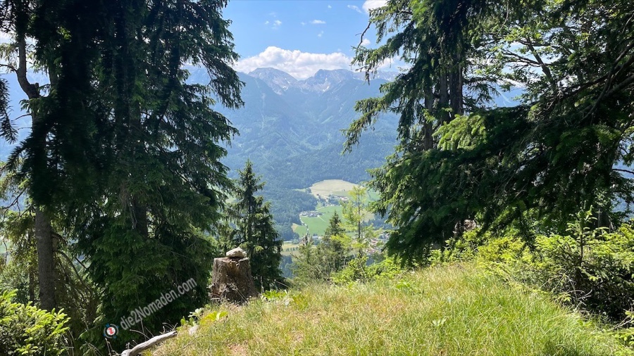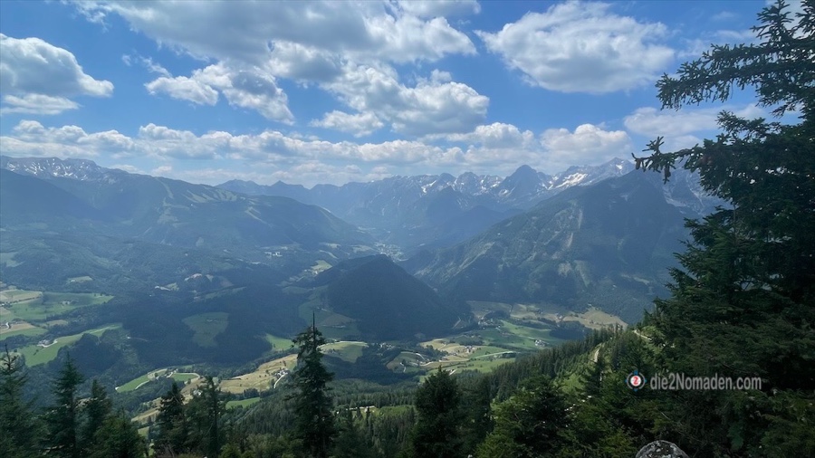 Schon hier haben wir eine traumhafte Aussicht auf das Tote Gebirge mit seinen noch immer schneebedeckten Gipfel.