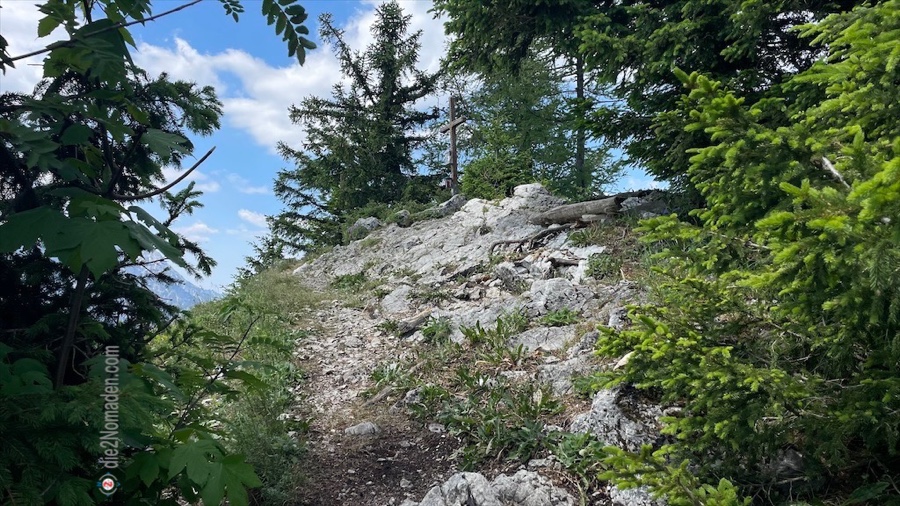 Hier heroben findet man ein kleines Gipfelkreuz und eine gemütliche Sitzmöglichkeit, um sich zu stärken und die Aussicht ins Stodertal, mit den noch immer schneebedeckten Gipfel zu genießen.