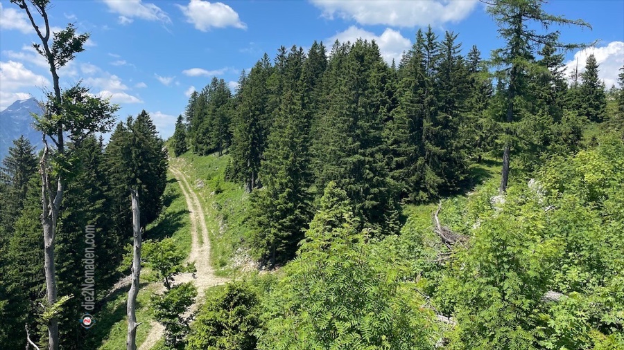Auch diese Schotterstraße queren wir und nehmen den Wanderweg nach oben. Dieser führt uns immer entlang eines Höhenrückens, einer Art „Grat“. Diese Bezeichnung hört sich gefährlicher an, als es in diesem Falle ist, denn der „Gratbereich“ ist hier mehrere Meter breit und sehr bewachsen. Trotzdem hat man eine wunderschöne Aussicht in die Täler.