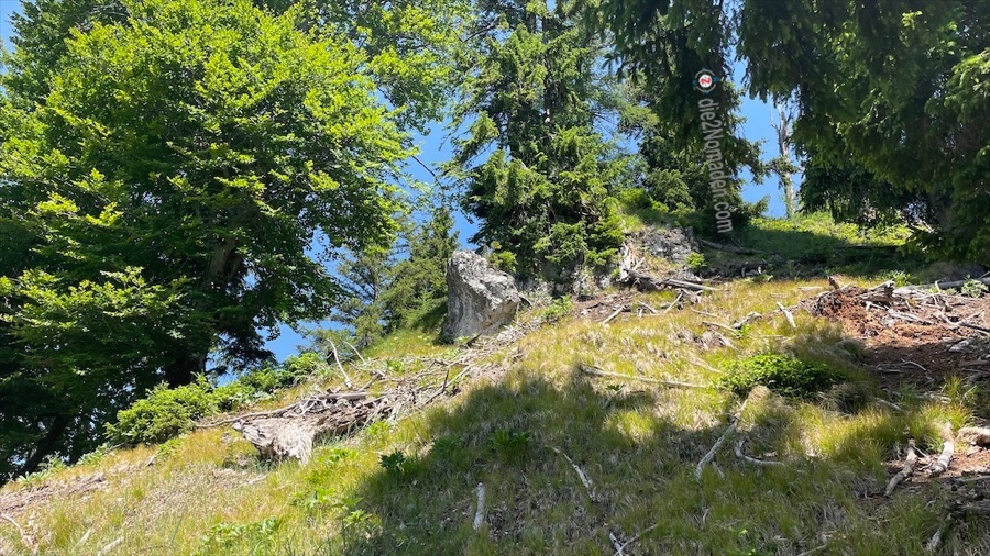 Nach einer Runde um den Hügel und der erfolgreichen Auffindung der höchsten Erhebung, muss ich feststellen, dass sich der Umweg keinesfalls gelohnt hat. Der Rücken ist bewaldet, es gibt keine Aussicht und Gipfelkreuz sucht man ebenfalls vergebens.