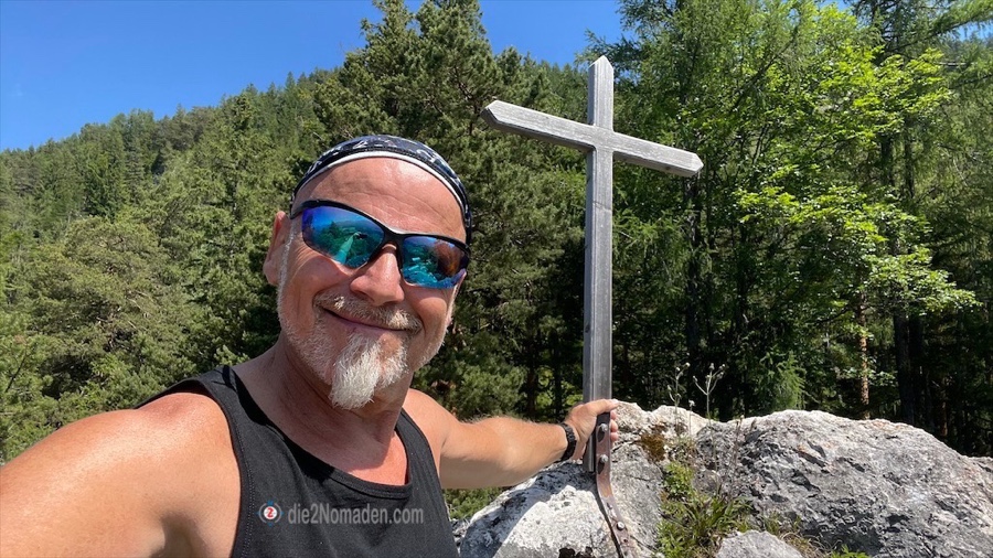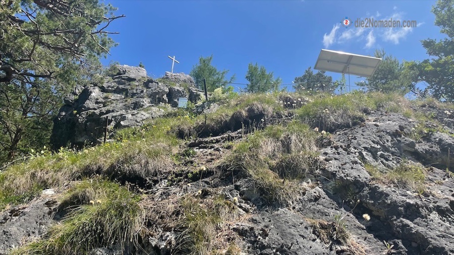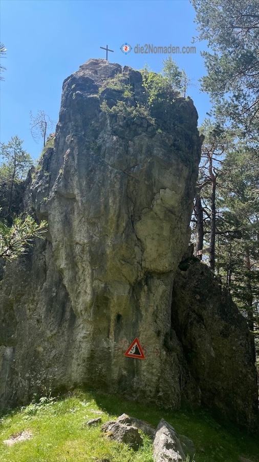 Hier stehen wir vor einem Fels-„Hinkelstein“, den man besteigen kann und ein eigenes Gipfelkreuz samt -buch hat.