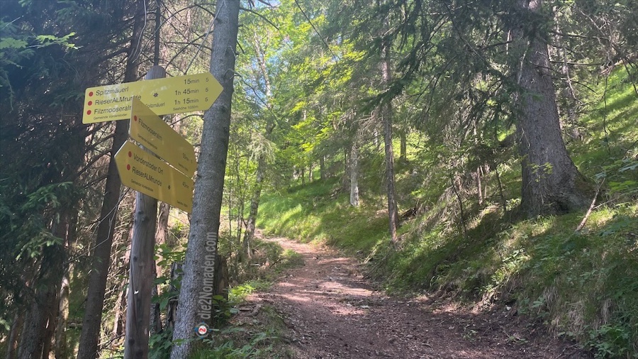 Wir stellen das Auto am P1 ab, starten die GPS-Uhr und wandern los Richtung Rieserhof. Kurz nach dem P2 biegen wir links ab und steuern zuerst das kleine Gipfelziel, Weg Nr. 5 Spitzmäuerl an.