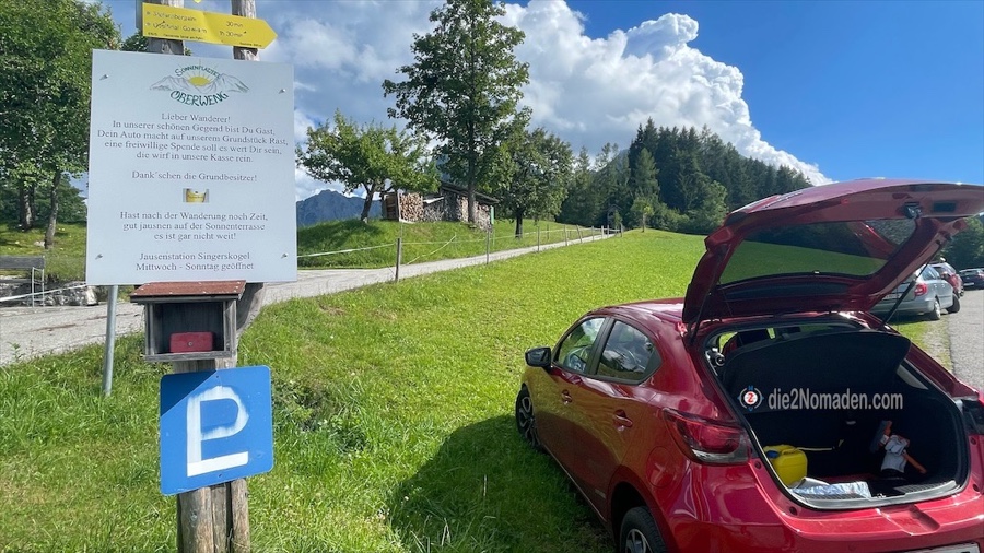 Unser Auto quetschen wir in eine kleine Parklücke auf dem Wanderparkplatz nach der Jausenstation Singerskogel und da es zu einer bewirtschafteten Hütte geht, packen wir nur das Notwendigste ein, montieren Ulis Wanderstöcke betriebsfertig und starten die GPS-Uhr für unsere Aufzeichnung der Tour.