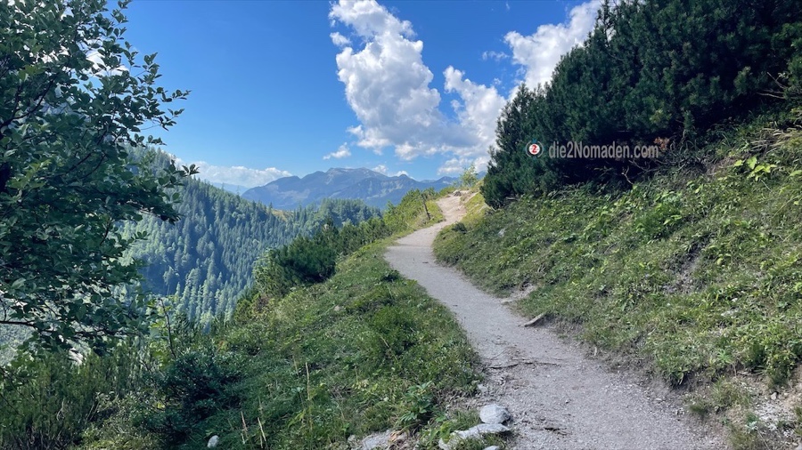 Das Gehen auf diesem weichen Almenboden ist ein herrliches Gefühl – wie auf Wolken. Nach etwa 15 Minuten führt der Weg nun wieder an den Waldrand und es geht nun steiler bergauf. Wir wollen ja die 1.375 m hoch gelegene Gowilalm erreichen. 😜