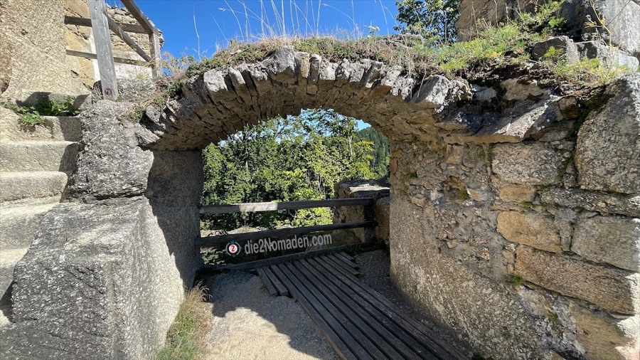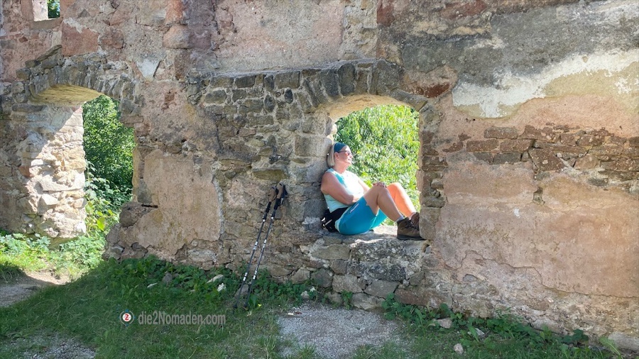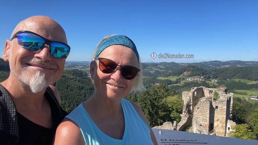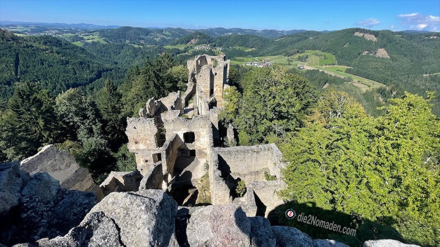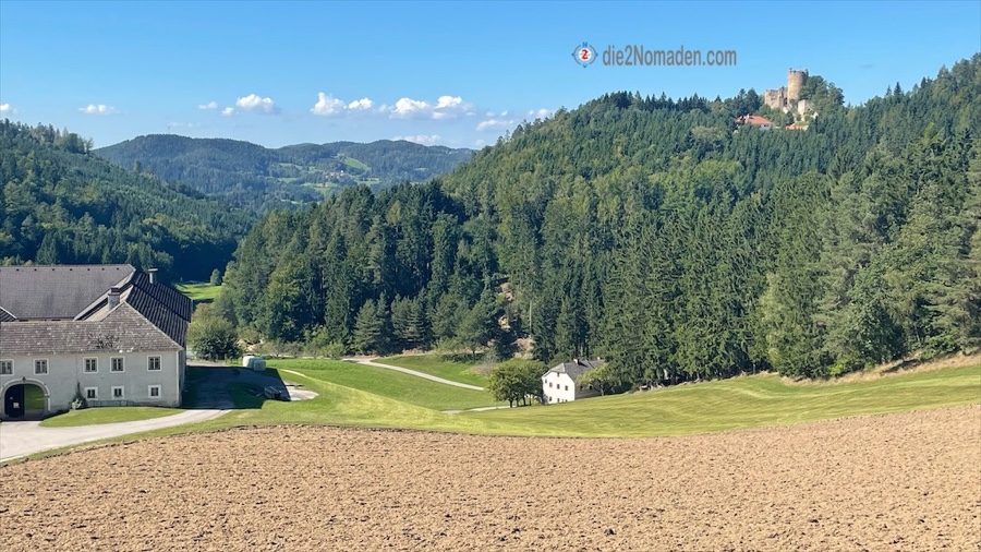 Wie aus dem Nichts stehen wir plötzlich vor den ersten Steinmauern der Burgruine Prandegg. Da wir nach der Besichtigung in der Burgtaverne einkehren wollen, nehmen wir erst mal den Weg zum Bergfried, der restauriert den Besuchern zwecks Besteigung kostenlos zur Verfügung steht. Oben angekommen staunen wir nicht schlecht über die großartige Rundumsicht. Hier bekommt der Ausdruck „tief ins Land eini schaun“ eine ganz andere Bedeutung.