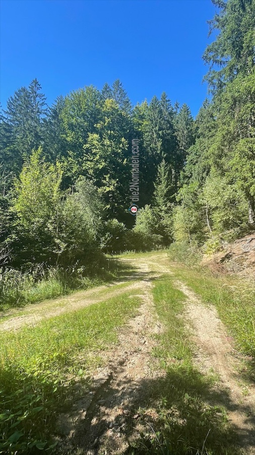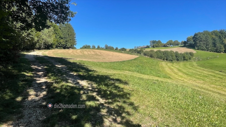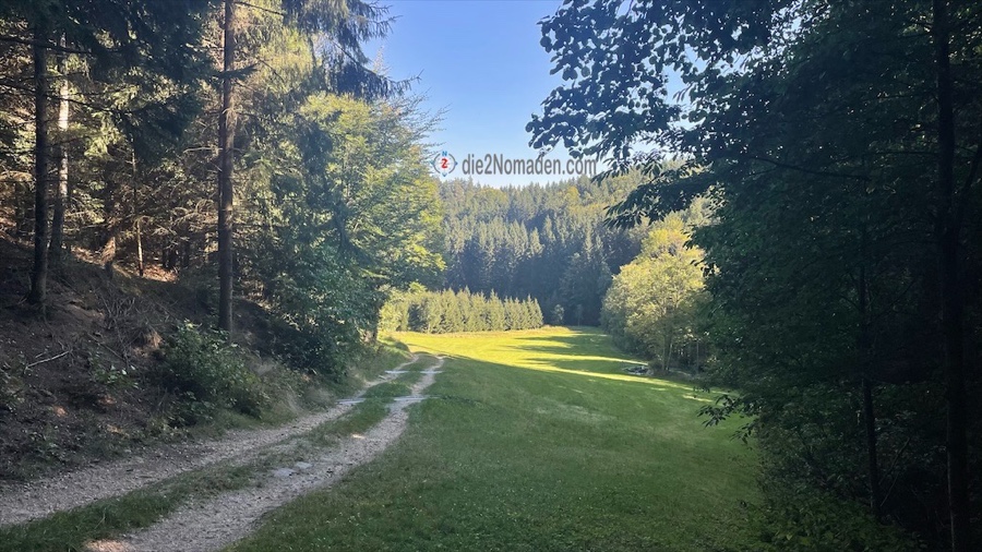 Wir nehmen den Wanderweg Nr.81, der uns relativ flott im Wald talwärts bringt, nehmen einen Forstweg bis zu einer kleinen Siedlung und dann einen angenehm zu gehenden Wiesenweg in eine Talsenke.