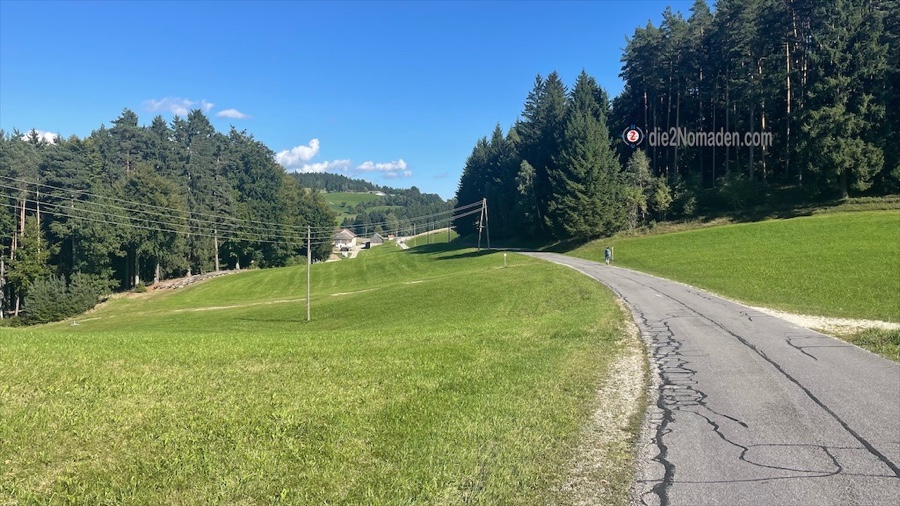 Es wechseln sich immer wieder mal Schotterstraße, Wald- und Wiesenwege ab und so gelangen wir zur Speed-Gleit-Bahn bei der Stoaninger Alm, die heute samstags regen Zulauf genießt.