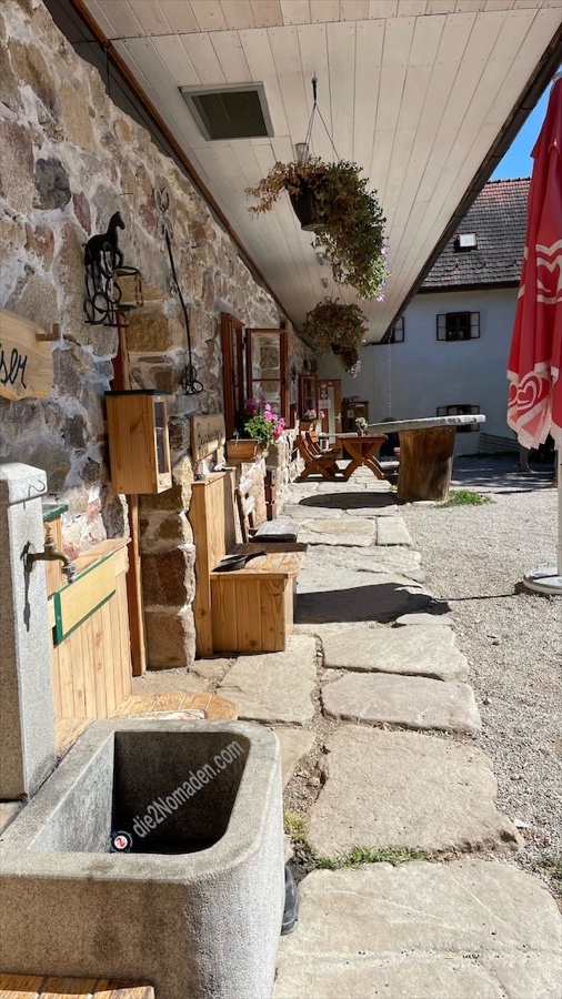 Nach unserer Besichtigung und der abschließenden Umrundung der Anlage kehren wir in der Taverne ein, genießen im ehemaligen „Innenhof“ bei tollem Wetter schmackhaftes Essen, ein Bier und herrlich selbstgebackenes Bauernbrot und unterhalten uns mit dem freundlichen Wirt der Gaststätte, bevor wir uns wieder Richtung Schönau aufmachen.