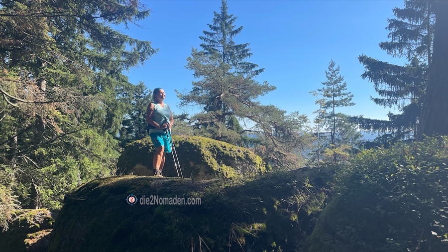 Uns beeindruckt die Felsformation, die sofort erklommen werden muss, samt montiertem Gedenkkreuz. Diese steil aufragende Felsgruppe bildet die höchste Erhebung von Schönau mit 855 m.