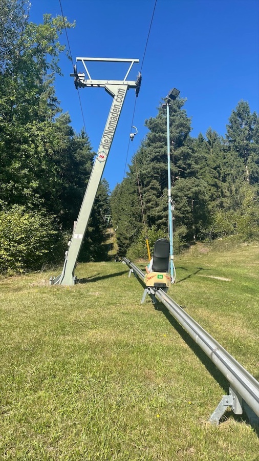 Etwas sonderbar mutet ein im Sommer aktiver Schlepplift an, doch wir folgen dem Wanderweg direkt neben der Schleppspur und freuen uns über aufmunternde Worte der Geschleppten, die mit ihren Zwergen sich gemütlich hinauf ziehen lassen.