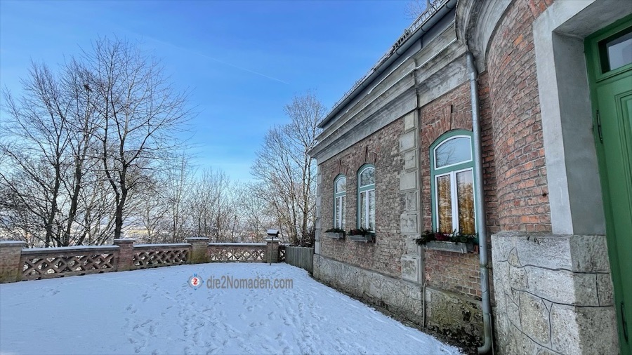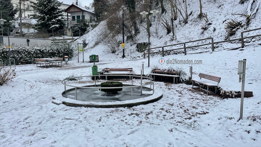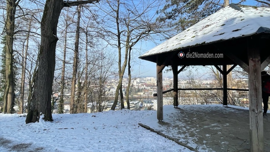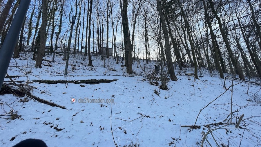 Ein Parkplatz war rasch gefunden, die Kneippanlage Reinberg ließen wir aufgrund Vereisung und des Nicht-Mitführens einer Axt aus und schon ging es in kleinen Serpentinen – die Treppen hinauf sind wegen Sturmschäden beziehungsweise Waldarbeiten gesperrt – hinauf vom Schatten in den strahlenden Sonnenschein.