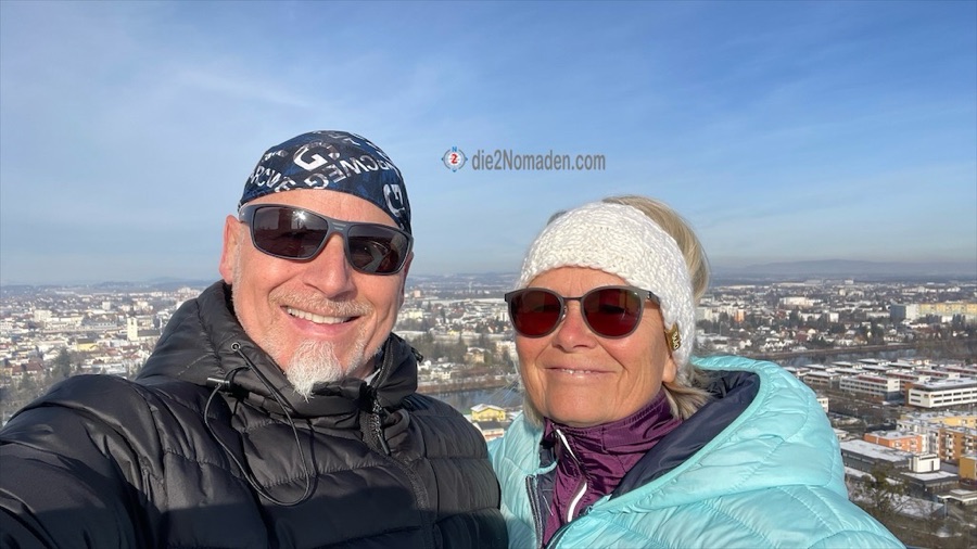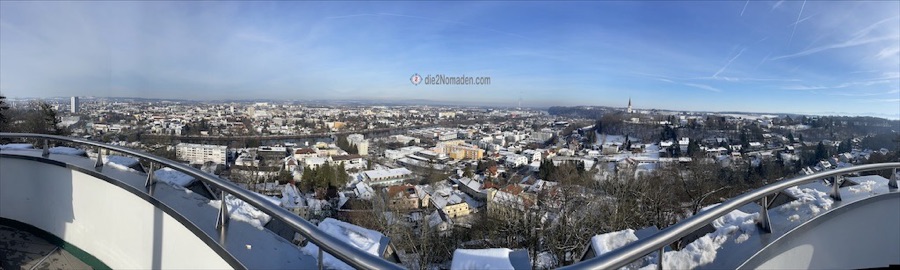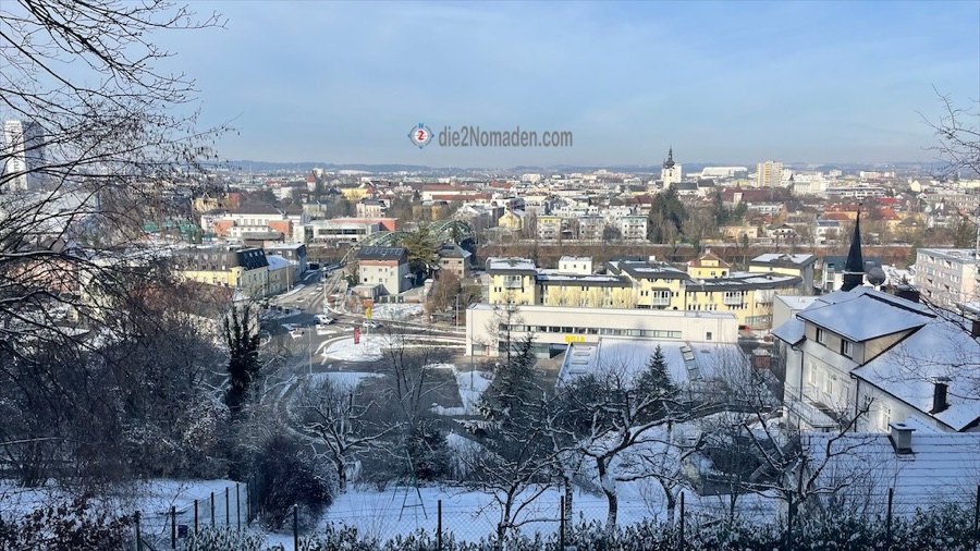 Schon bald entdeckten wir die wunderschöne, 22,8 Meter hohe Marienwarte, die 1891 am Reinberg erbaut wurde. Von der Aussichtsplattform, welche 391,1 Meter über dem Meeresspiegel liegt, hat man einen wundervollen Ausblick auf die Stadt Wels, die Traun-Ebene und an diesem Tag sogar bis zu den Alpen.