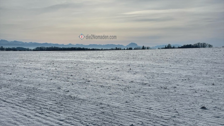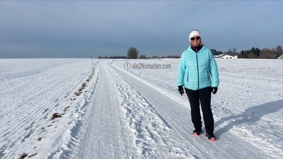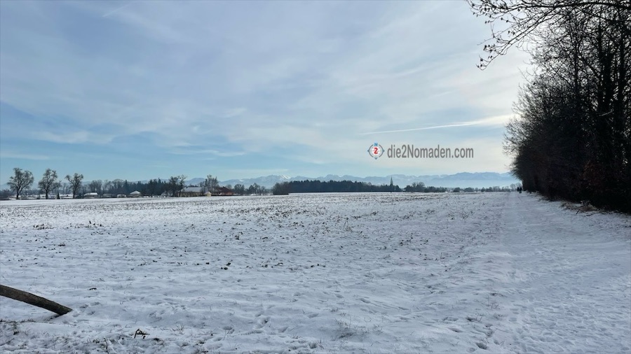 Hilft nix – es ist wie es ist und weiter gehts hinauf. Oben angekommen und ein paar tiefe Atemzüge später, geht es eben weiter. Schon bald liegen die letzten Häuser von Thalheim hinter uns und wir wandern auf schneegepressten Straßen durch weite, weiße Felder. Leise Panik kommt auf und ich frage meinen Wanderguide André, ob wir wohl auf dem richtigen Weg wären, weil es den Anschein hat, als würden wir eher den Traunstein erreichen, als zurück nach Thalheim zu kommen. Ein kurzer Blick auf das Navi bestätigt dies und so geht es weiter über sehr ruhige Straßen, wo kaum Autos unterwegs sind und die Fernsicht ein Wahnsinn ist.