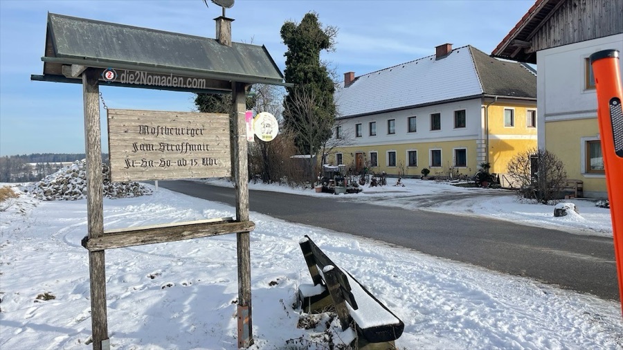 Wir wandern durch ein paar ziemlich vereiste Straßen in Thalheim (die Grödel haben wir natürlich nicht mit) und obwohl diese Tour nur wenige Höhenmeter versprach, geht es allerdings stetig bergauf. Nachdem ich (Uli) die Tour ausgesucht habe, kann ich mich nicht einmal lauthals beschweren, sollte es doch heut gemütlicher werden. Nicht nur der gestrige Abend sondern auch die 10 km der gestrigen Wanderung am Almsee liegen mir in den Beinen.