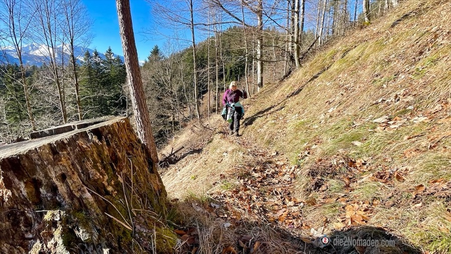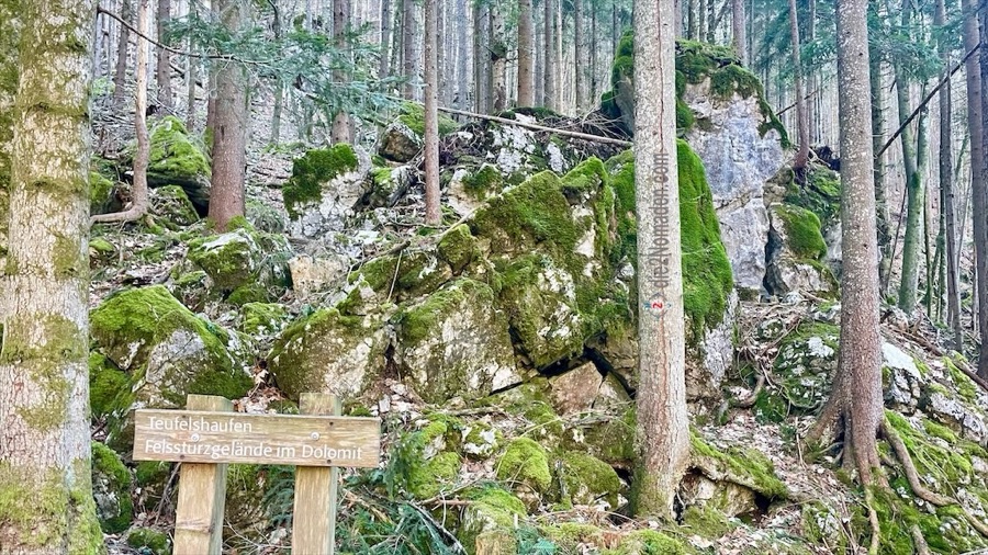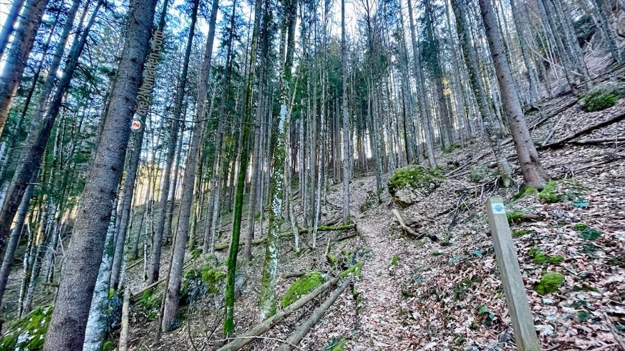 Der schattige Bereich des Wanderweges ist noch mit einem leichten Raureif überzogen, jedoch völlig schneefrei und so steigen wir langsam, step by step, durch die Dolomitsteinblöcke im Wald. Vorbei geht es an einem gewaltigen Windbruch am Teufelshaufen und an mächtigen Tannen und alten Eiben. Nach etwa 1 Stunde erreichen wir den sonnigen Bereich des Höhenrückens am Patzlberg und einige Meter später den gleichnamigen Aussichtspunkt samt gemütlicher Sitzgelegenheit. In der warmen Jahreszeit sicherlich ein toller Jausenplatz.
