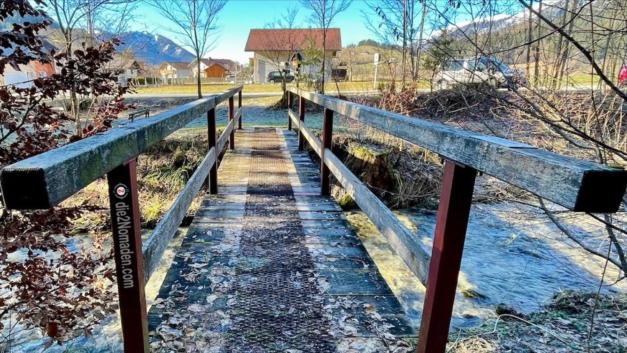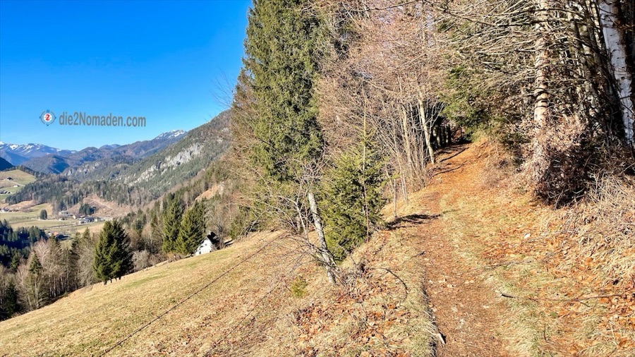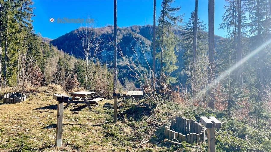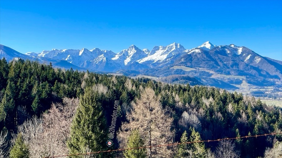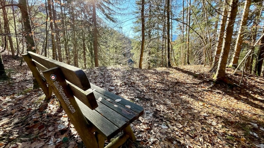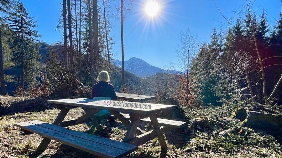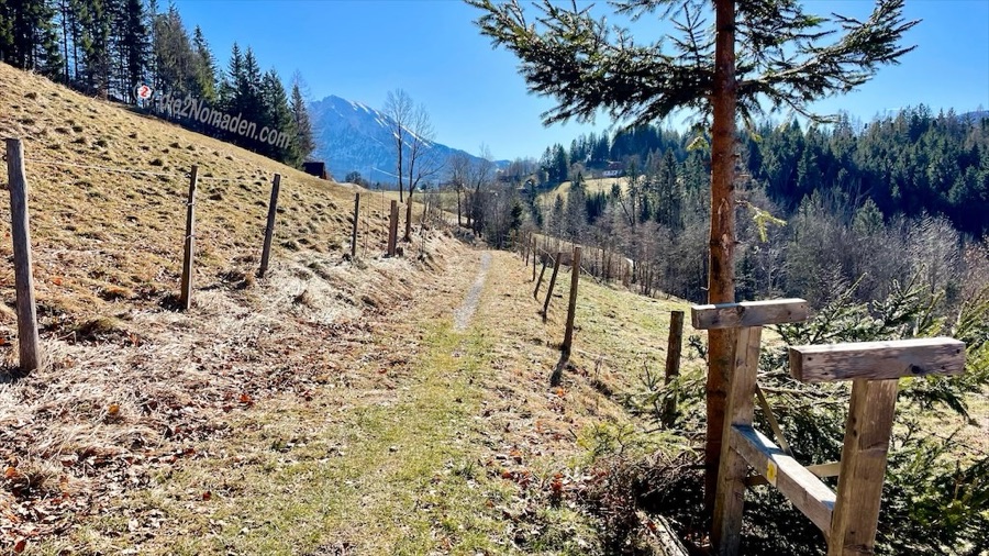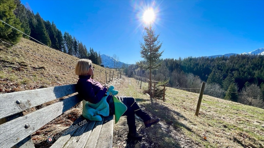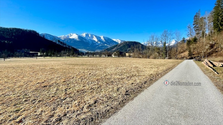 In diesen Talbereich kommt im Winter kaum die Sonne und so ist die Forststraße sowie der Wanderweg noch immer gefroren – „immer noch besser als matschig“, meint Frau Nomadin. Es geht wieder stetig hoch zur Anhöhe des Wurbauerkogels. Bevor die ersten Häuser sichtbar werden, kommt man aus dem Wald und erreicht einen idyllischen Weg und ein nettes Sonnenbankerl mit traumhafter Aussicht auf das Tote Gebirge.