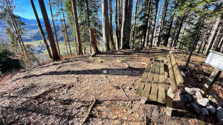 Gut gelaunt marschieren wir weiter, auf einem Weg, der leider nicht sehr gut markiert ist und erreichen auf 736m Seehöhe die Zeller Aussicht. Dieses Bankerl wurde vom Alpenverein in Gedenken an Herrn Emil Zeller (1848-1932) zu seinem 60. Geburtstag gewidmet. Leider hindern die Bäume, die im Laufe der Zeit eine beachtliche Größe erreichten, die Aussicht, die früher sicher spektakulär gewesen sein muss.