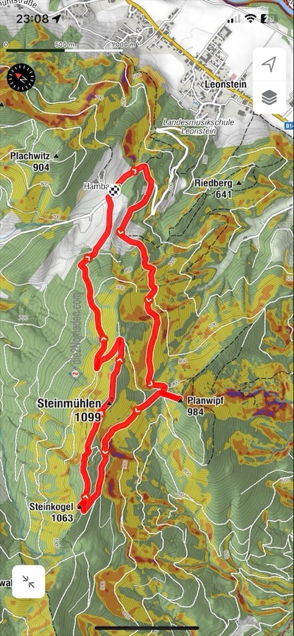 Das nehmen wir gerne an und so füttern wir die kleine Box, packen unsere Sachen, starten die GPS-Uhren und gehen ein kurzes Stück die Straße retour Richtung Leonstein.