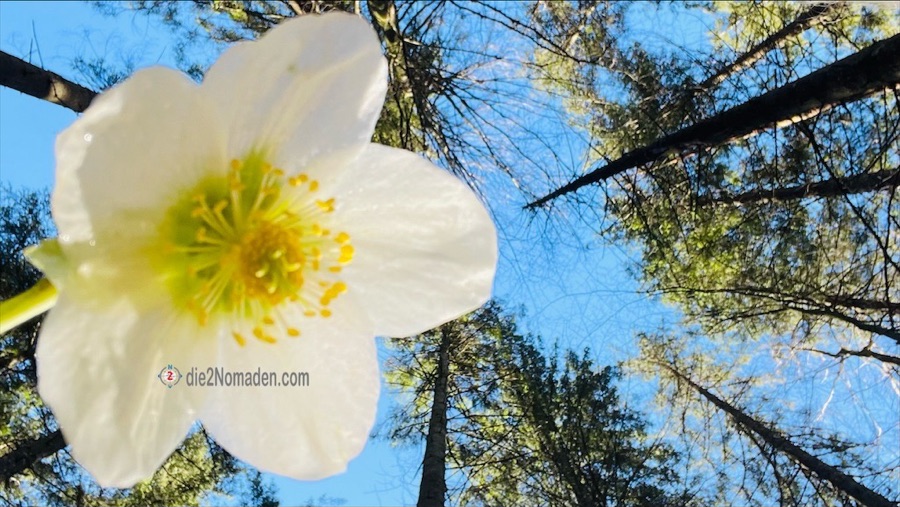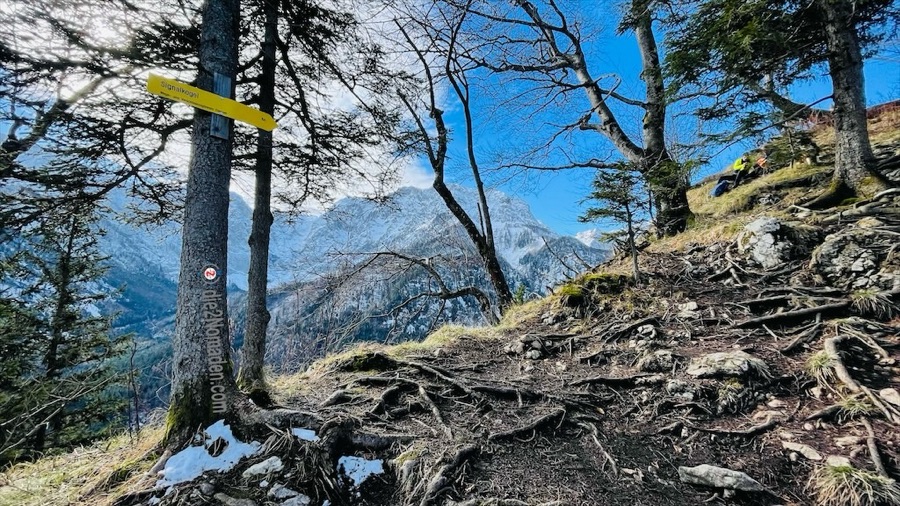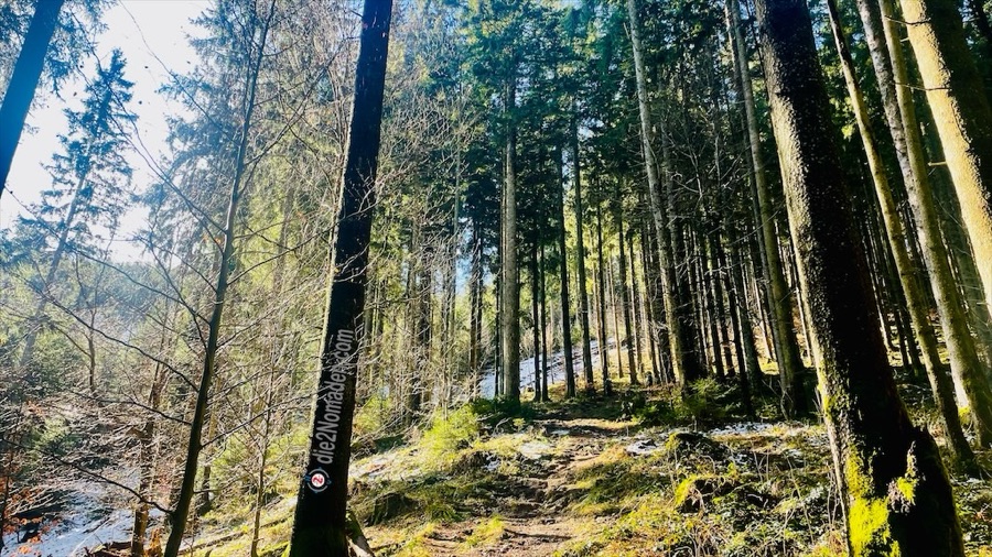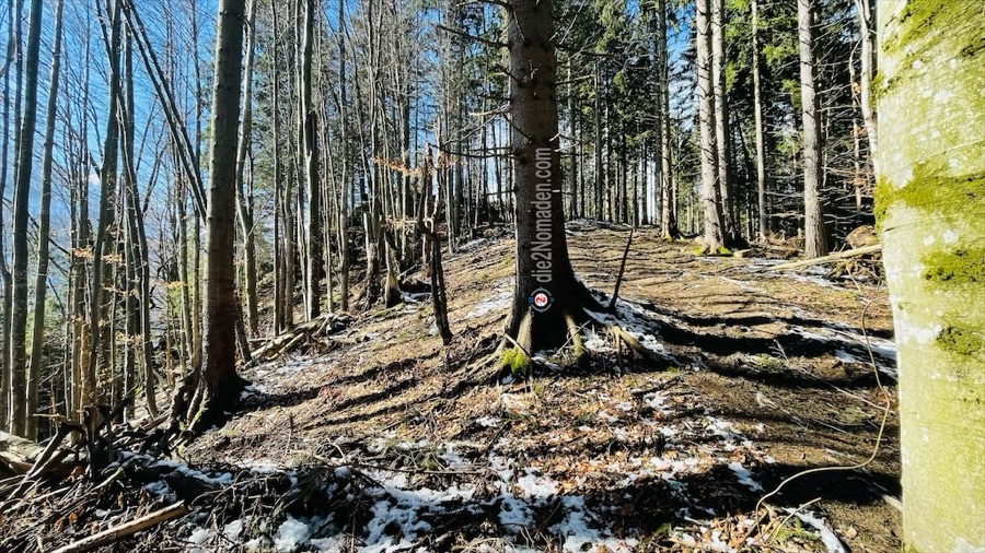 Nach etwa 1,5 Kilometern biegen wir links in den Wald ein. Ab hier beginnt der eigentliche Aufstieg und ist erwartet schwierig. Nicht, weil es so steil wäre. Nein, aber der geschmolzene Schnee hat die Erde im Wald derart aufgeweicht, dass es fast wie eine Rutschpartie wirkt. Einzig die hervorstehenden Wurzeln ermöglichen uns ein halbwegs sicheres Vorwärtskommen.