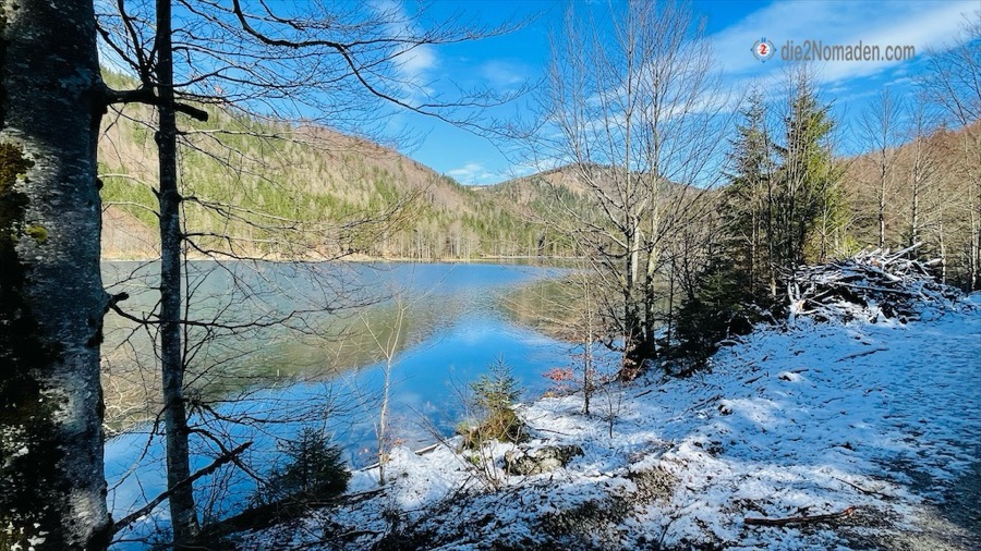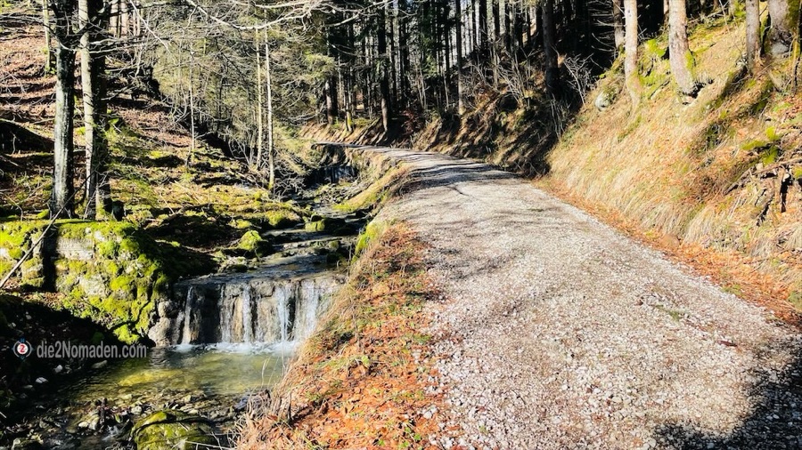 Die Forststraße führt uns entlang des Sees. Wir nehmen nicht den Zugang zum Parkplatz, sondern gehen die Schotterstraße weiter, biegen des öfteren links sowie rechts ab.