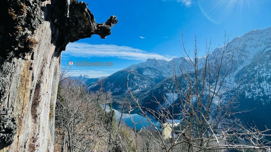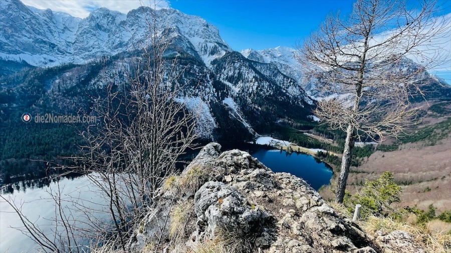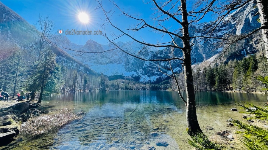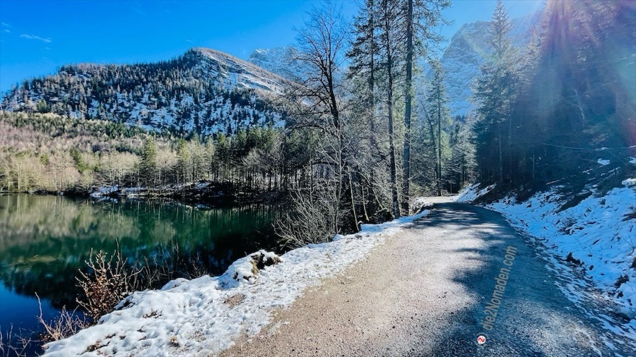 Wir halten uns aber am Beginn des Hinteren Langbathsees nicht sehr lange auf und starten gleich die Umrundung. Je näher wir den Bergen kommen, umso kälter wird es. Die Sonne kommt, aufgrund der steil abfallenden Bergflanken, kaum bis zum Boden, wodurch noch Schnee und gefrorene Bereiche am Rundweg vorhanden sind.
