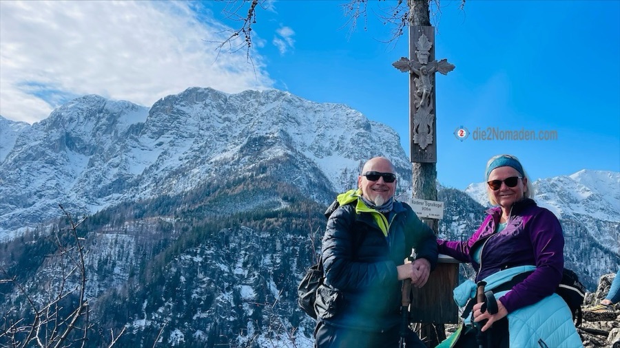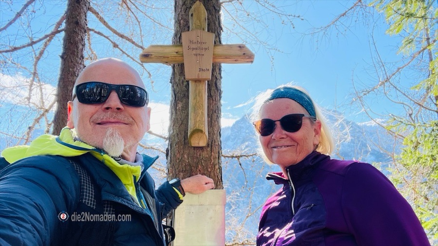 Trotz rutschigen Terrains schaffen wir es, langsamer als sonst, nach gut zwei Kilometern am Gipfel des Vorderen Signalkogels zu stehen und das natürlich nicht alleine. Einige Wanderer sind schon vor uns angekommen und genießen genauso wie wir diese unbeschreibliche Aussicht. Schöner gehts fast nimmer.