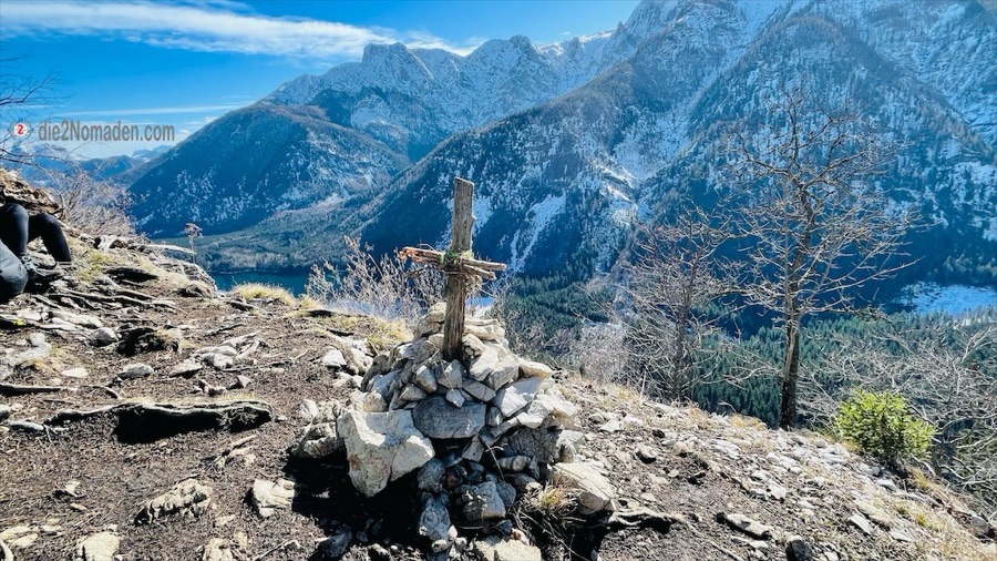 Kurze Zeit später nehmen wir den Weg, der den Grat entlang weiterführt. An einer freien Stelle mit traumhafter Aussicht steht ein selbstgebasteltes Gedenkkreuz. Wieder sind schon einige Wanderer vor uns hier und haben es sich im Gelände um das Kreuz gemütlich gemacht. Wir machen einige Aufnahmen und folgen sogleich dem Weg weiter, der uns nun talwärts bringt.