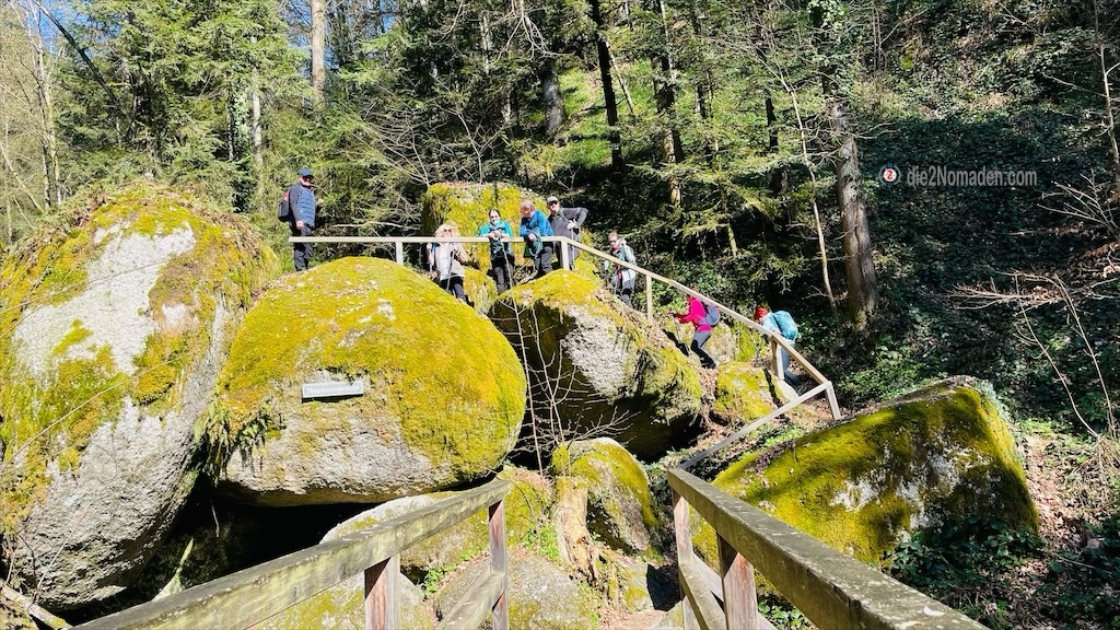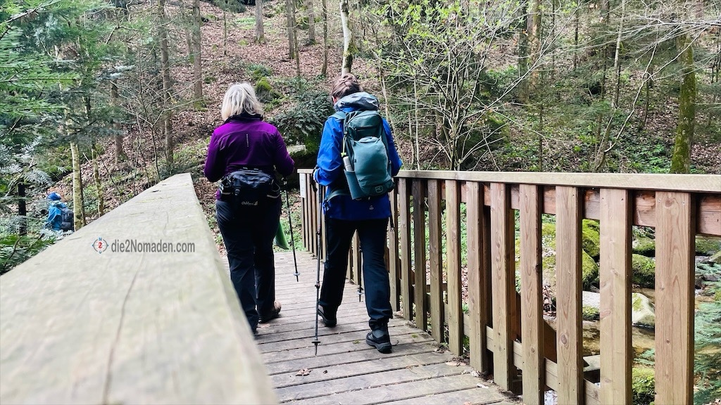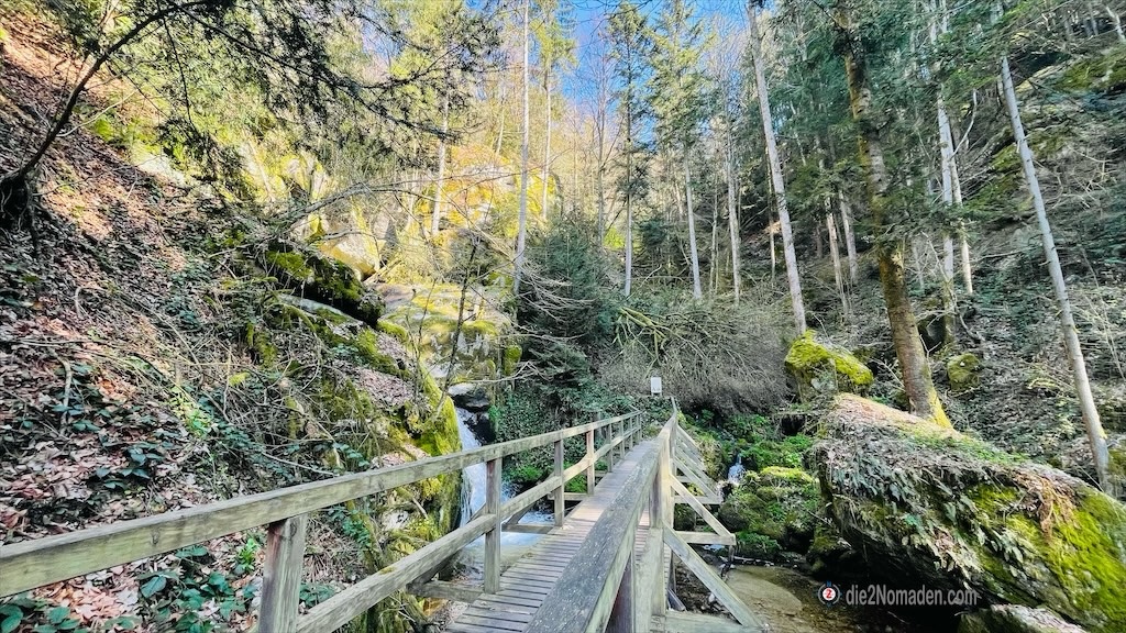 Hier verlassen wir die Wolfsschlucht, nehmen den linken Fahrweg durch den Mischwald und folgen einem der Zubringerbäche.