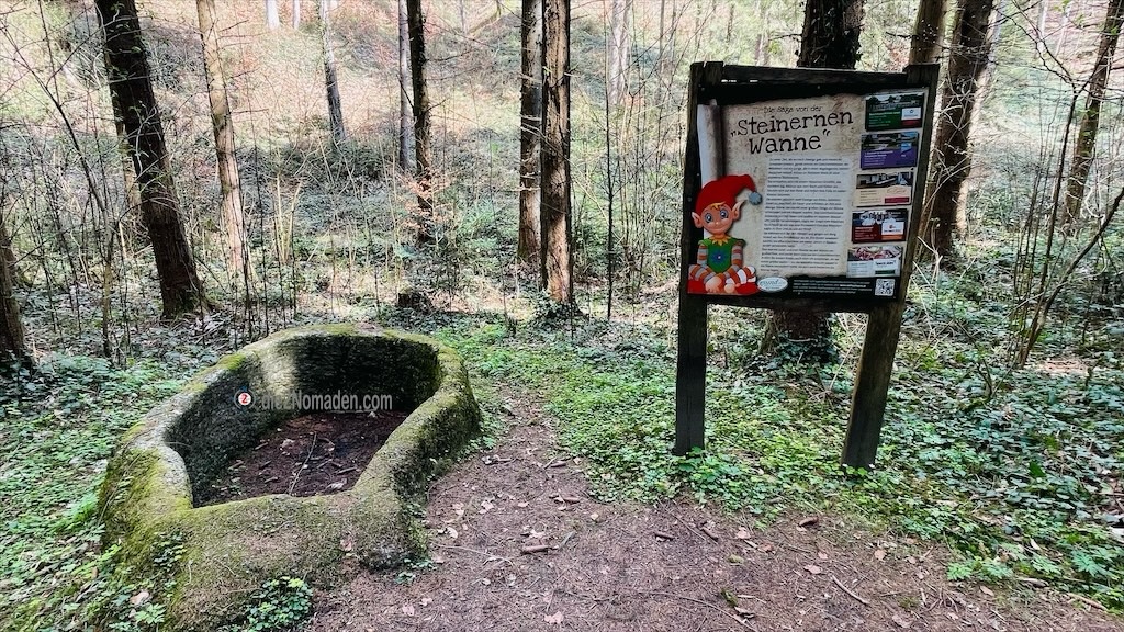 Kurz vor Ortsbeginn nehmen wir in einem spitzen Winkel den Güterweg Schönfichten, folgen der Asphaltstraße für ca. 500 m und biegen wieder rechts auf eine Forststraße ein. Diese folgt dem Kreuznerbach, vorbei an der sagenumwobenen „Steinernen Wanne“ und treffen kurze Zeit später wieder an ein Badebecken, welches wir zuvor verlassen haben.