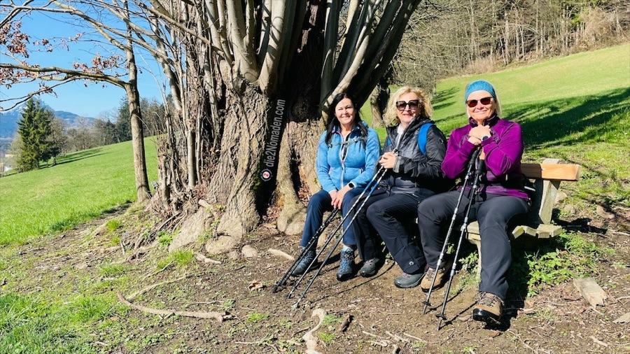 Hier nehmen wir dann linksseitig den Weg, steigen Schritt für Schritt hoch und erreichen schon bald einen alten, knorrigen und sehr ausladenden Baum mit einer netten Sitzbank. Die Damen der heutigen Gruppe sind froh über diese unerwartete Pause, nehmen sofort Platz und beschließen, ein erstes Foto zu knipsen.