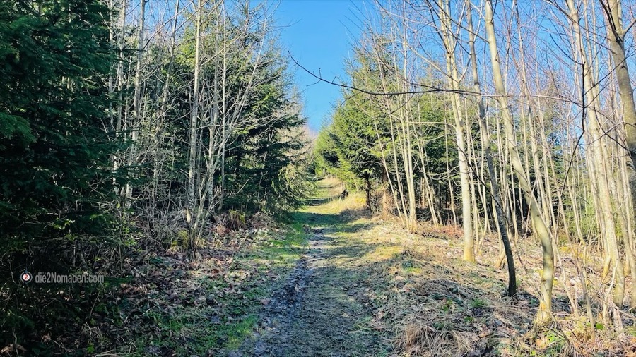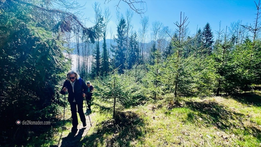 Nach etwa 700 m, bei der Straßenkehre, führt der Wanderweg geradeaus weiter in den lichten Wald. Schritt für Schritt geht es höher und wir erreichen eine Holzhütte an einer Forststraße. Hier wird uns erstmalig so richtig warm und wir beschließen, uns unserer äußeren Kleidungsschicht zu entledigen.