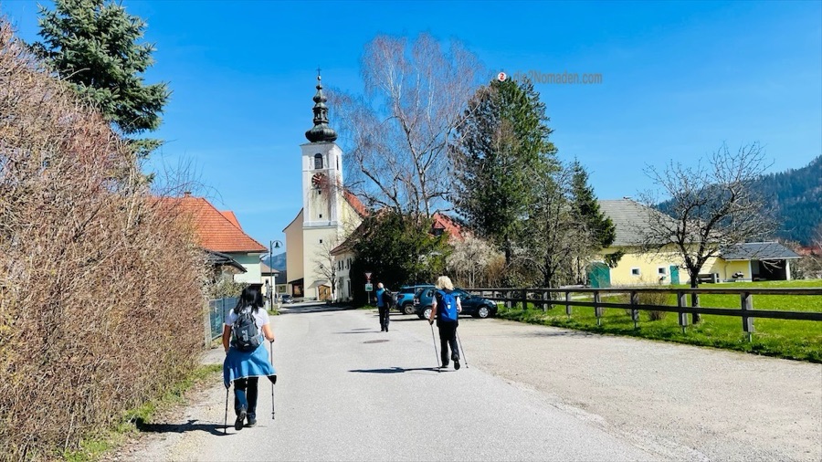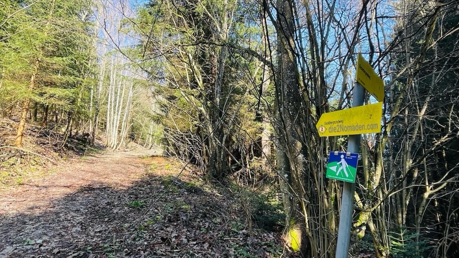VIECHTWANG. Wir packen unsere Sachen zusammen, wenden uns der gegenüberliegenden Straßenseite zu und folgen dem Wanderweg Nr. 7 Hacklbergrundweg bzw. immer der Beschilderung der Nordic-Walking-Runde Hacklberg. Die Beschilderung führt uns gleich einmal zwischen einigen Gebäuden hindurch und man hat das Gefühl, mitten durch einen Hof zu gehen.