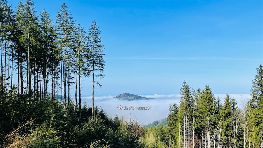Wir folgen der Forststraße, die sich langsam westwärts wendet und erreichen etwa bei Kilometer drei die höchste Erhebung, den Hacklberg. Umsonst versuchen wir, an dieser Erhebung ein Gipfelkreuz zu finden, doch am direkten Weg finden wir keine Markierung oder sonstige Anzeichen dieses Gipfels. Nun ja, dann halt einmal kein Gipfelkreuz, dafür ein Stück weiter ein Kahlschlag mit sensationeller Fernsicht über dem Nebelmeer.