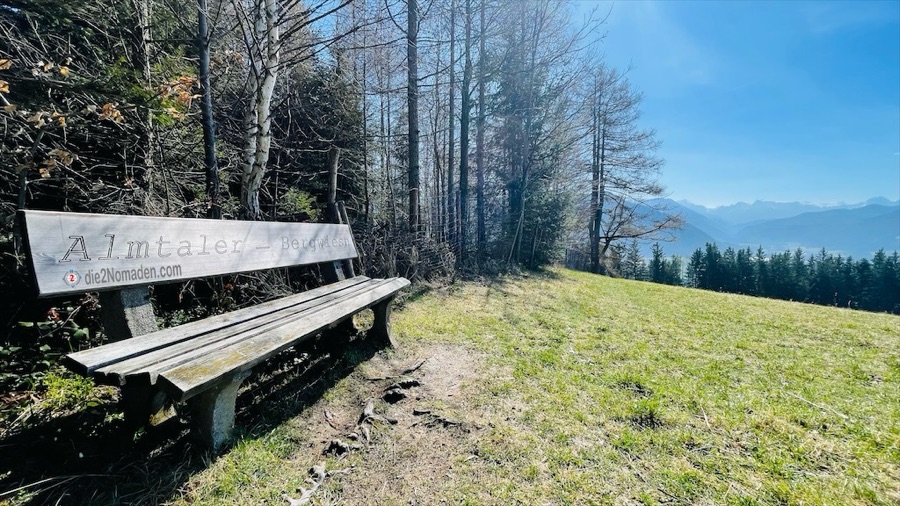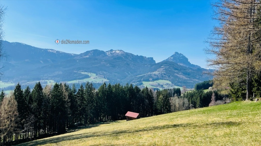 Dann entschließen wir uns die Forststraße zu umgehen, die von den Waldarbeiten etwas mitgenommen ist und wandern auf einem schmalen Waldweg links weiter, bis wir eine Lichtung erreichen. Wow, das hat sich aber nun wirklich gelohnt. Hier haben wir eine Fernsicht bis ins Gebirge. Wir verweilen auf dieser Lichtung ein Weilchen, weil es gar so schön ist und treffen ein kurzes Stück später wieder auf die Forststraße, der wir nun weiter Richtung Westen folgen. Hier sind einige Sonnenbankerl angebracht, die auch schon von Wanderern genutzt werden. Bei der Aussicht kein Wunder. Etwa 1,5 km später, bevor der Wald beginnt, nehmen wir den kaum erkennbaren Feldweg links am Waldrand entlang runter und erreichen einen Hof, das wir rechtsseitig umgehen.