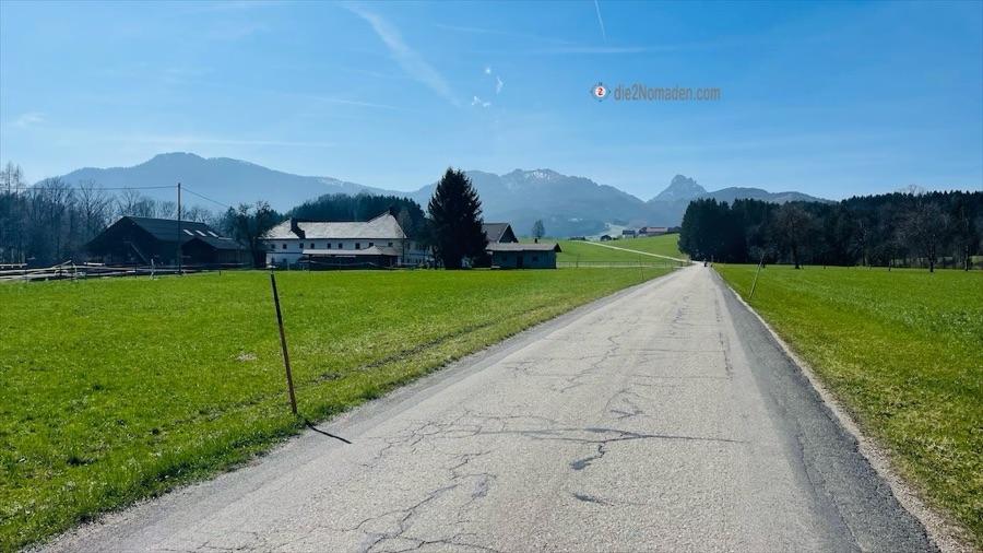 Wir dürfen netterweise jedoch noch den ursprünglichen Weg durch den Hof nehmen, folgen nun in entgegengesetzter Richtung der Zufahrtsstraße zum Hof und erreichen 20 Minuten später die Bundestraße, direkt gegenüber dem Gasthaus Schobermühle.