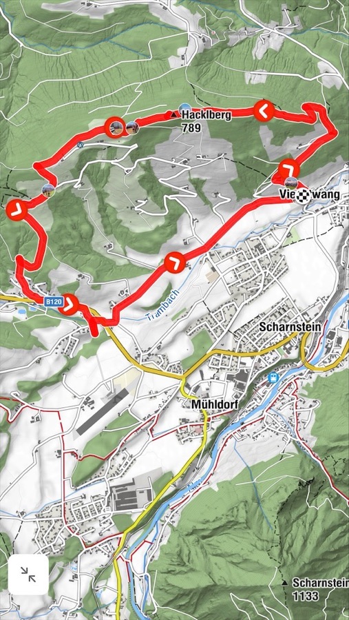 Da wir uns jedoch für eine Rast im Gasthaus Taverne zur Thann entschieden haben, folgen wir nun etwa 5 Minuten der Bundesstraße Richtung Scharnstein, bevor wir rechts in die Seitenstraße zur Gaststätte einbiegen.