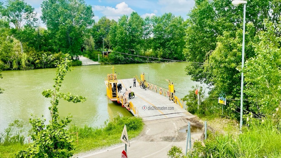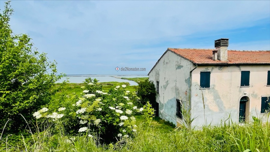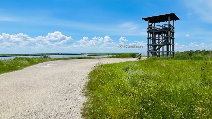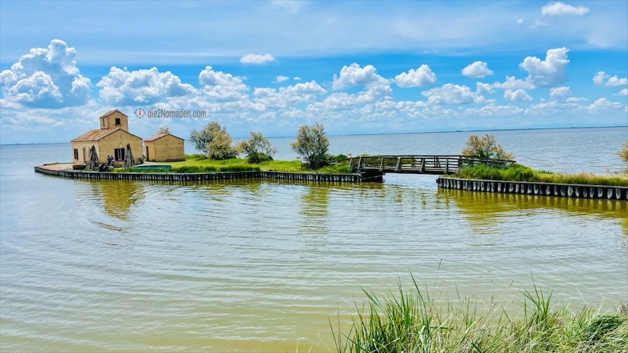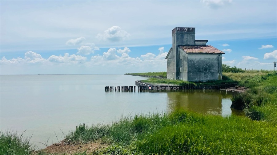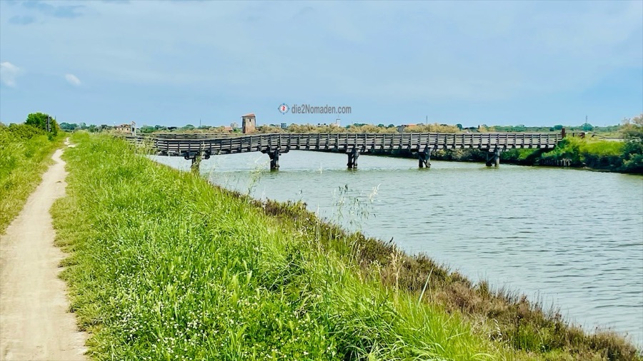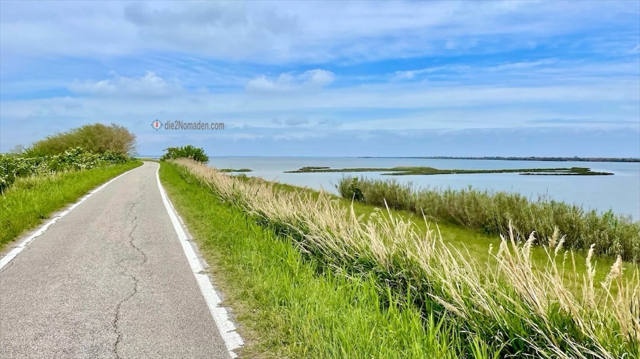 Und dann kommen wir an im Parco Regionale Delta del Po. Über eine Fußgänger- und Radbrücke geht es direkt hinein in die Lagune auf einem schmalen Damm, der ins Wasser gebaut ist. Komisches Gefühl so durch diesen See zu fahren, links und rechts nur Wasser – soweit das Auge reicht. Kurz denke ich daran, dass ich hier kein Gewitter erleben möchte, aber die Freude über dieses Ereignis überwiegt und so erreichen wir wieder das Festland.