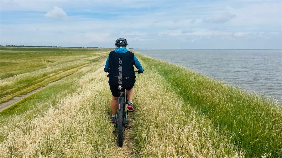 Der erste Stopp muss sein, da der Wind noch sehr kühl ist am Morgen, zieht es uns gleich einmal in eine Jacke. Hilft übrigens auch gegen Gelsen. Und wenn ich euch sage, dass ich zwölfzig Trillionen gezählt habe, ist das nicht untertrieben. Die uns entgegenkommenden, radelnden Italiener fahren mit Halstuch über Mund und Nase. Nun, haben wir nicht, also werden wir erstmal die Klappe halten.