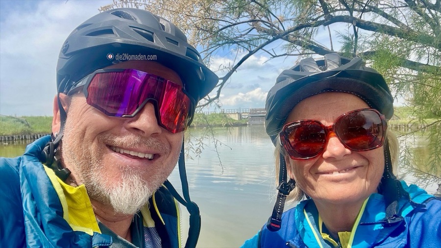 Einmal um die Kurve und schon sind sie da – Flamingos. Ach, sind die schön. Andreas schleicht sich wieder an und filmt und fotografiert. So geht das eigentlich die nächsten 20 km dahin und dann beschließen wir, nicht mehr stehenzubleiben. Wieviele Fotos von Flamingos sollen wir noch machen? Also wird in die Pedale getreten und wir fahren diesen tollen Radweg in einer Gruppe mit unseren Freunden – den Gelsen.