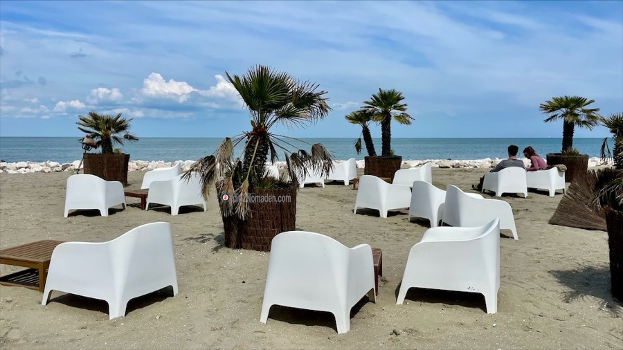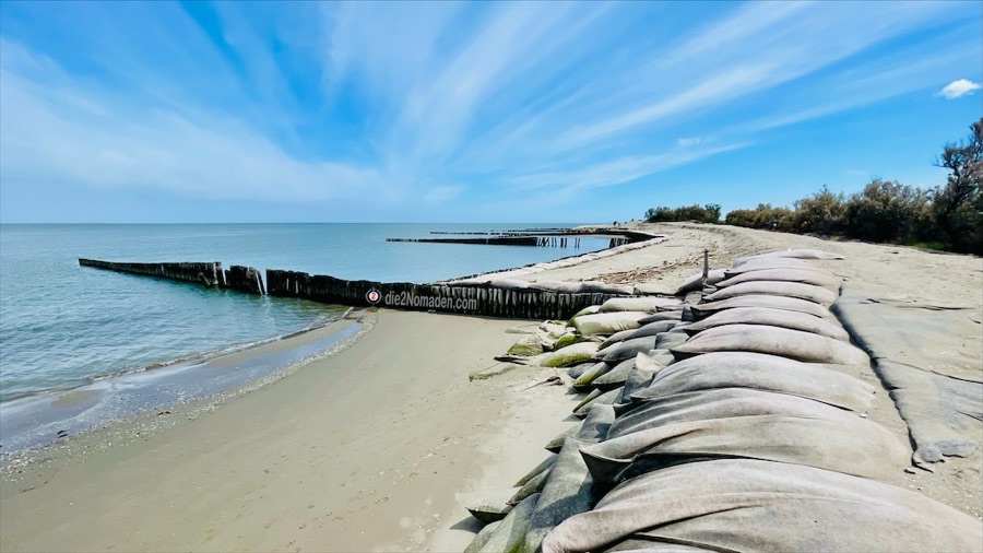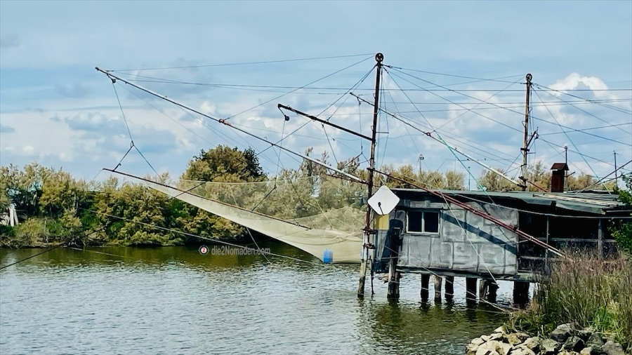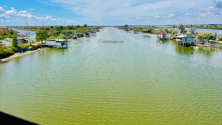 Weiter gehts auf diesem herrlichen Damm und wir erreichen die Fischerhütten am Portocanale. Hier werden Aale, Wolfsbarsch, Seezunge, Meerbarbe, Brasse und Flunder gefischt und wir erblicken ein Boot, das mit Kisten voller Miesmuscheln beladen ist. Nur noch ein kurzes Stück, dann erreichen wir Lido di Spina, das wir aber rechts liegen lassen und den Strand entlang Richtung unseres Campingplatzes radeln.